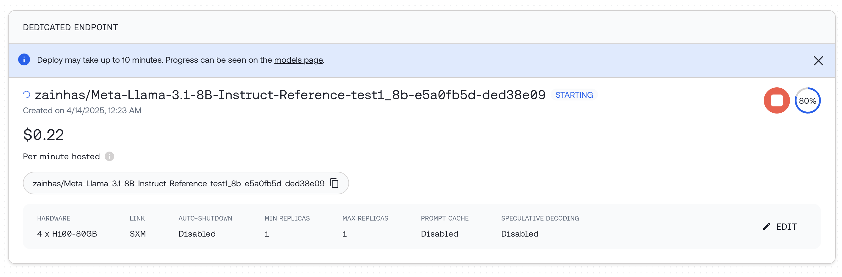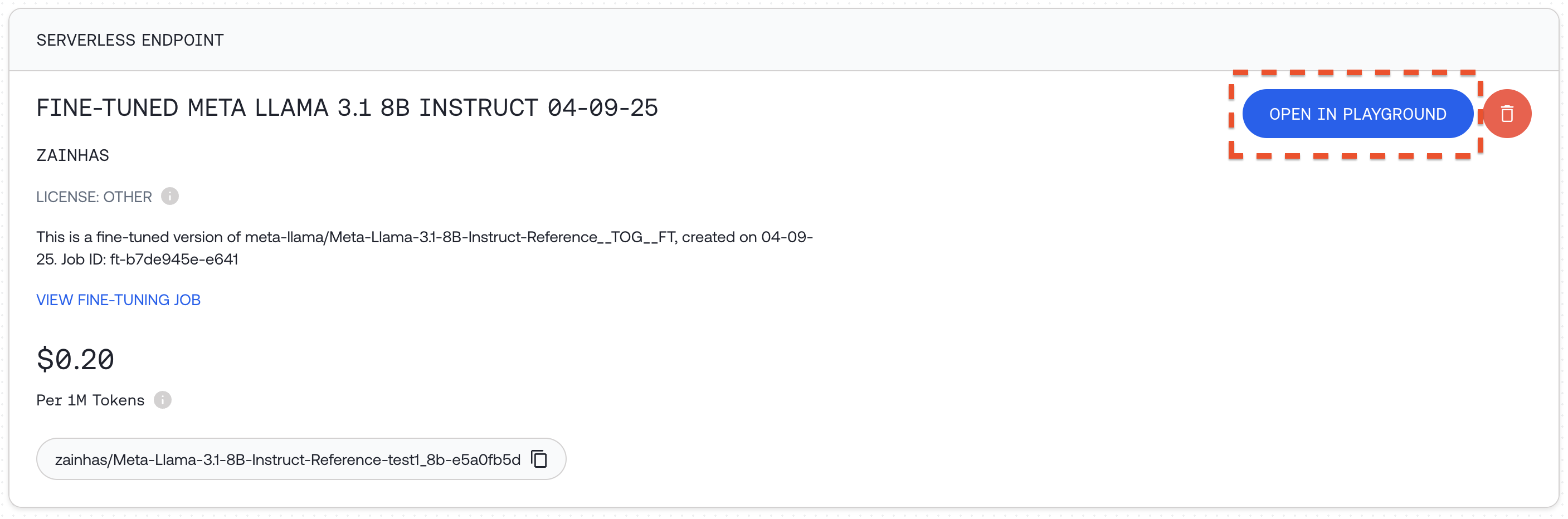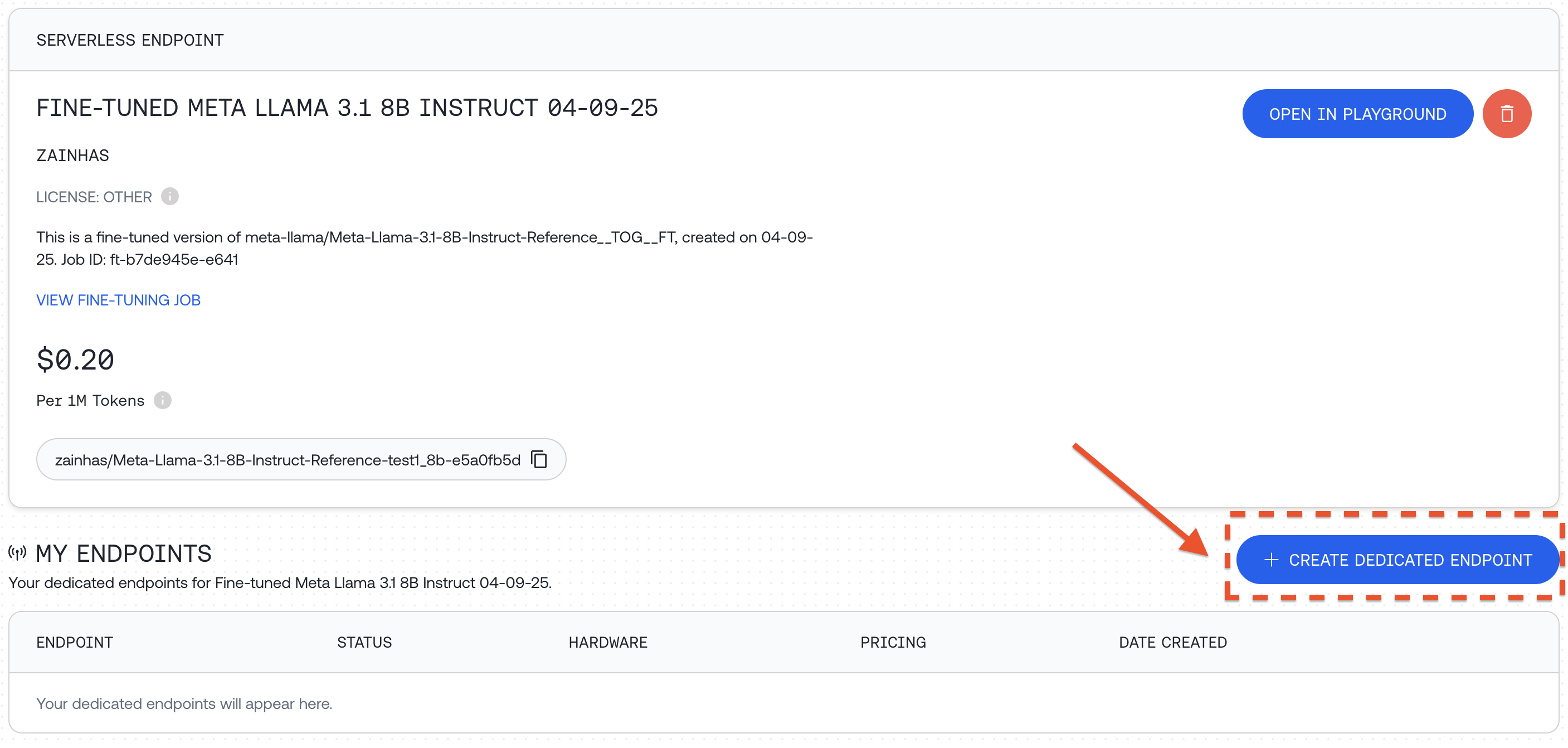 "+ CREATE DEDICATED ENDPOINT"for your fine-tuned model -