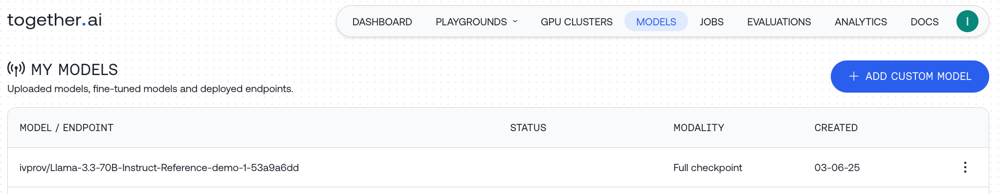 Once your fine-tuning job completes, your model will be available for use: Option 1: Serverless LoRA Inference If you used LoRA fine-tuning and the model supports serverless LoRA inference, you can immediately use your model without deployment. We can call it just like any other model on the Together AI platform, by providing the unique fine-tuned modeloutput_name from our fine-tuning job.