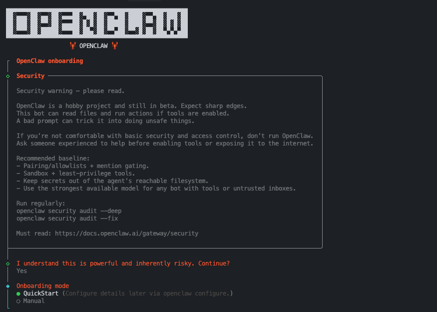 Start the Gateway and begin chatting — via the web UI, CLI, Telegram, or WhatsApp:Environment note