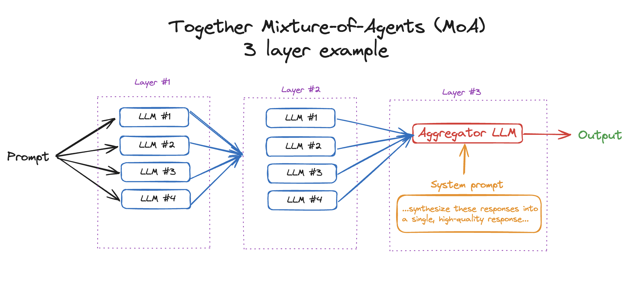 In the previous example, we went over how to implement MoA with 2 layers (4 LLMs answering and one LLM aggregating). However, one strength of MoA is being able to go through several layers to get an even better response. In this example, we’ll go through how to run MoA with 3+ layers.