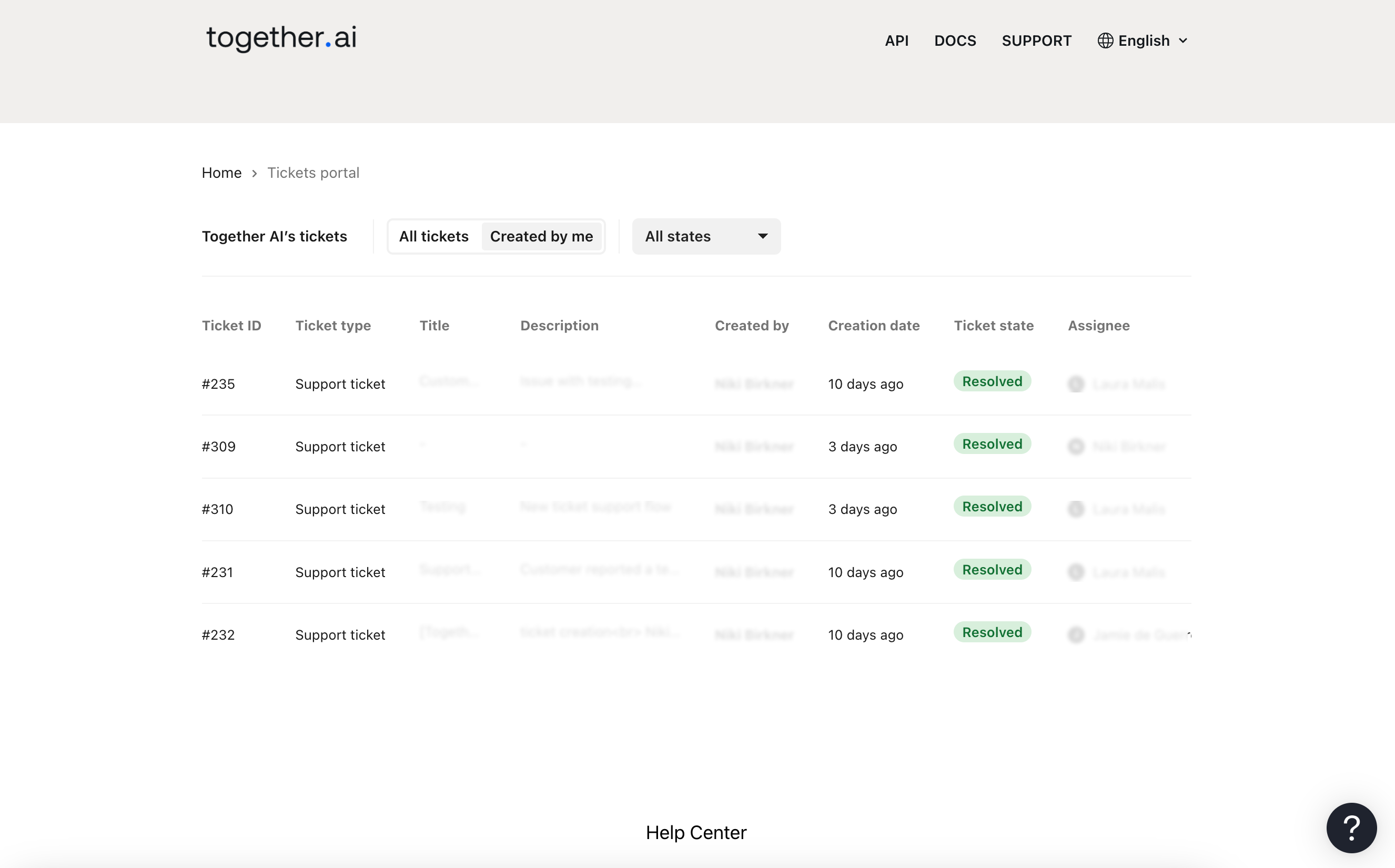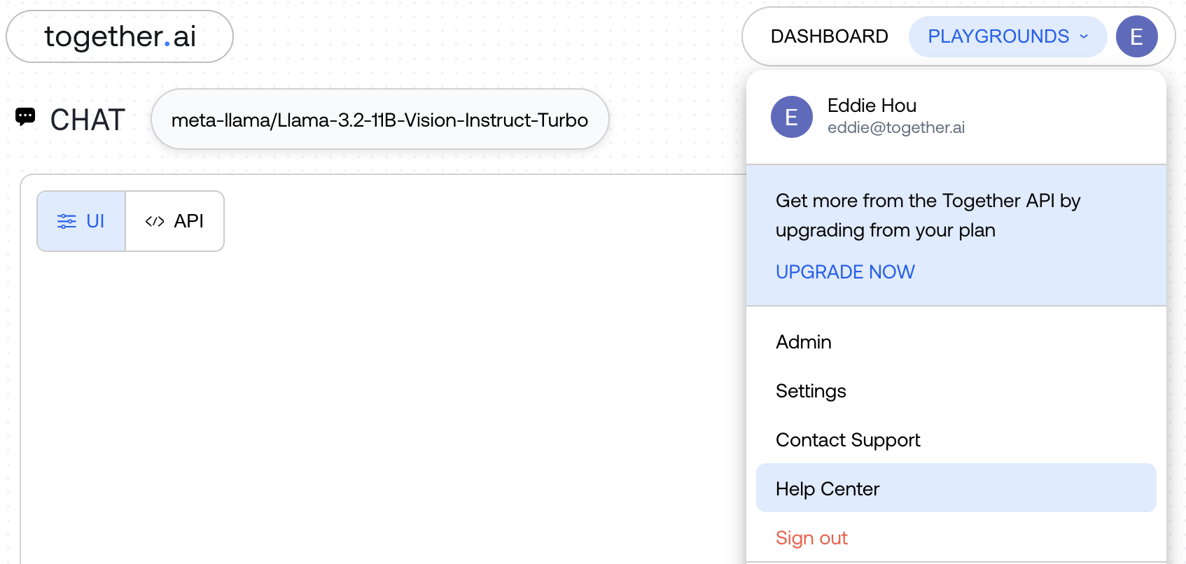 To access your portal, first navigate and login to api.together.ai and click on “Help Center”